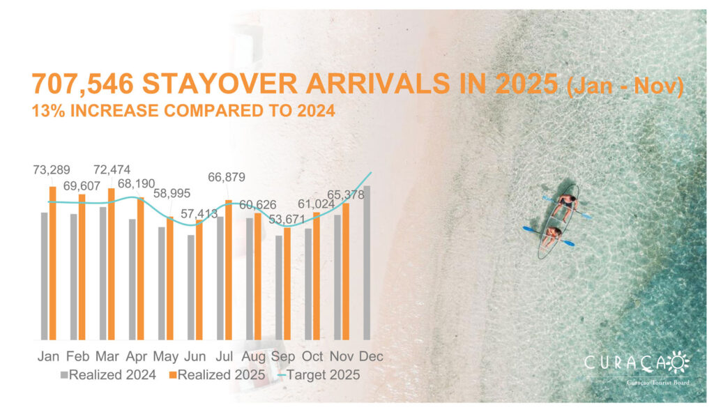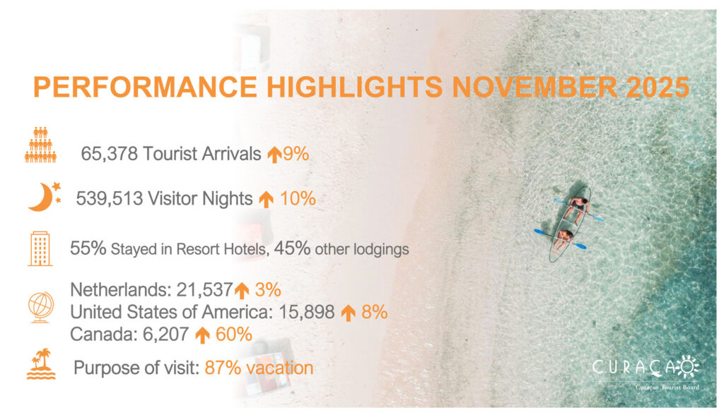 WILLEMSTAD – 16 di desèmber 2025 –Ofisina di Turismo di Kòrsou (CTB) ta kontentu pa raportá kresementu kontinuo den prestashon di turismo, novèmber 2025 a registrá un kresementu sólido di 9% kompará ku novèmber di aña pasá. Total 65.378 turista di estadia a bishitá nos pais na novèmber 2025.