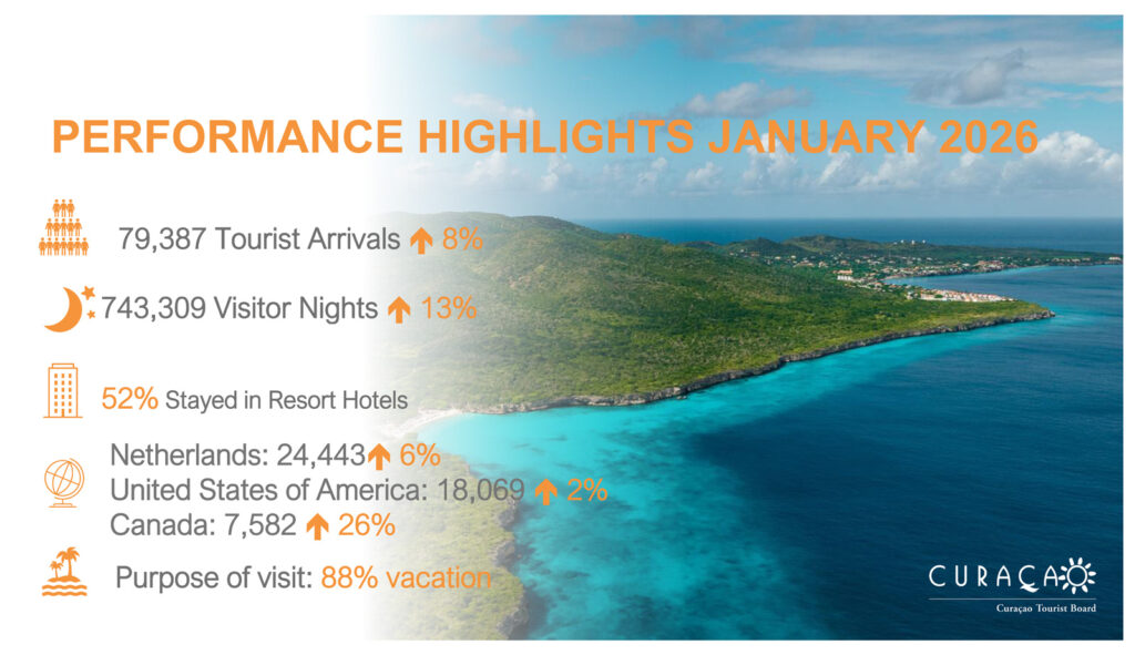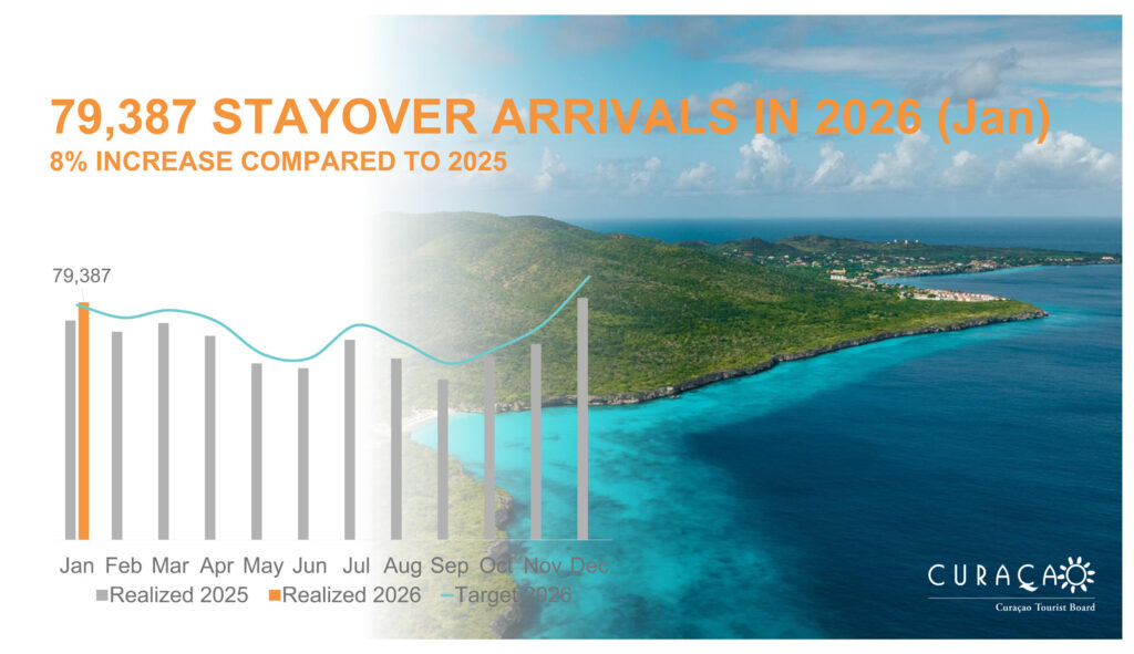 WILLEMSTAD – 13 di febrüari 2026 –Ofisina di Turismo di Kòrsou (CTB) ta raporta kresementu kontinuo den kantidat di turista di estadia na luna di yanüari 2026, influensiá pa demanda for di tur e merkadonan prinsipal. Yanüari 2026 a registrá un kresementu di 8% kompará ku yanüari 2025, kual ta 6.098 turista adishonal. Total 79.387 turista di estadia a keda risibí den e promé luna di aña. E prestashon konsistente aki ta reflehá e demanda di e biahero i ta duna indikashon di un temporada di turismo vibrante, yegando na kasi 80 mil turista di estadia den un luna.